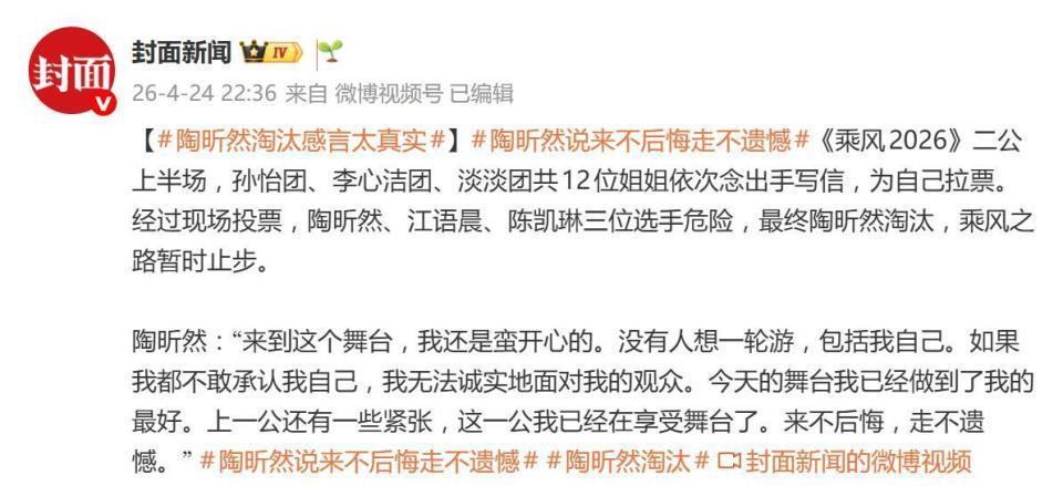 但比淘汰更让人印象深刻的,是她说的话。陶昕然在暂别感言里没有卖惨,没有煽情,而是扔出一句:" 来不后悔,走不遗憾。" 她还补了一句,说自己不想虚伪地说 " 想快点走 "," 我不是这样的人 "。这话一出,不少网友直呼:这才是成年人的体面退场。
